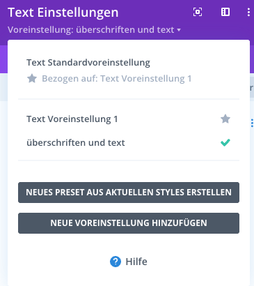Das sind die Einstellungen, die man bei einem Element abspeichern kann, z.B. kann man bei einem texte Element alle Sachen wie Text Grösse, Schriftart oder Farbe einstellen und dann abspeichern als Voreinstellungen das man bei einem anderen Textelemente nicht nochmal alles einstellen muss. Ein weiterer Vorteil ist das, wenn ein Kunde Änderungsvorschläge hat z.B. die Farbe gefällt im nicht, da muss ich es nur in dem voreingestelltem preset einstellen und es wird dann automatisch auf alle anderen Elemente die gleiche Voreinstellung haben ändern.
